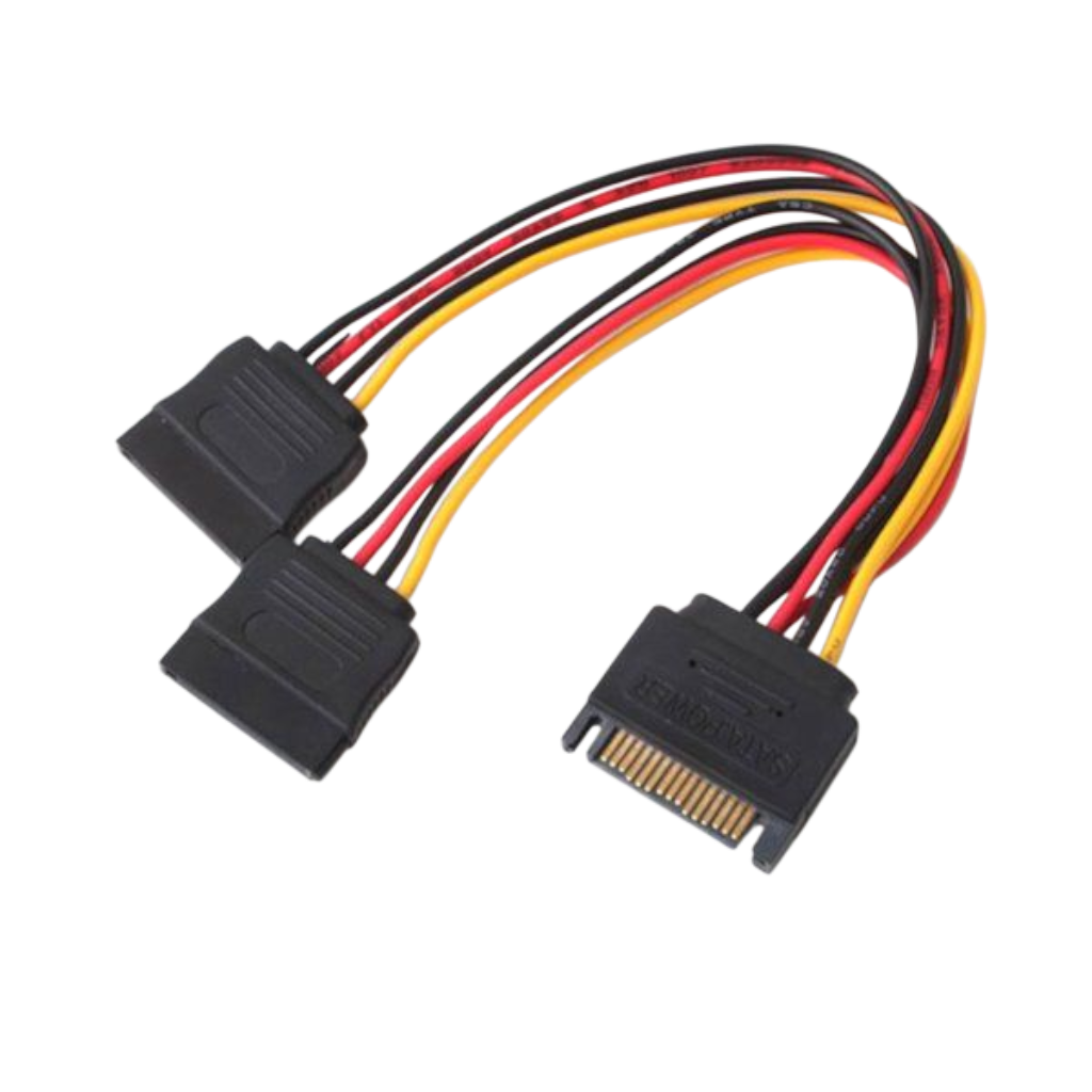 מפצל SATA Power עם חיבור זכר אחד ושתי יציאות נקבה להזנת שני כוננים מאותו מקור מתח.
